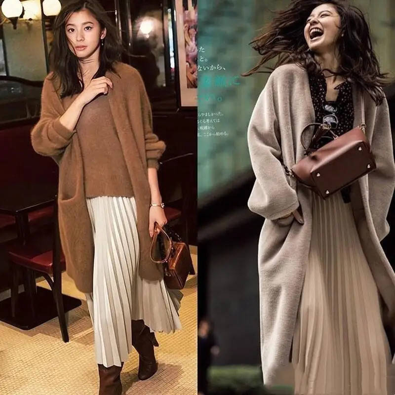 普通大众不知道怎么选衣服颜色的时候推荐,你可以选择卡其色和驼色系来进行组合搭配,比如上面驼色的大衣外套,内搭针织毛衣,加上白色的百褶半身裙,脚上穿的驼色的中筒靴,这样的穿搭就能使得你变得很有朝气。