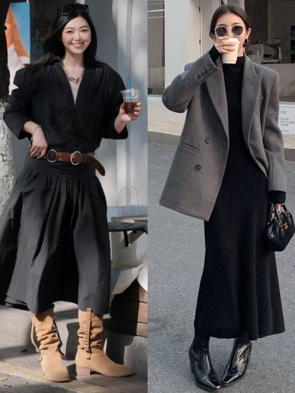 就好比如上面这两位的穿搭,驼色的中筒靴确实会稍微更加有品质,搭配上黑色皮质半身裙,驼色的大衣外套,散发出来的气质又飒又美。