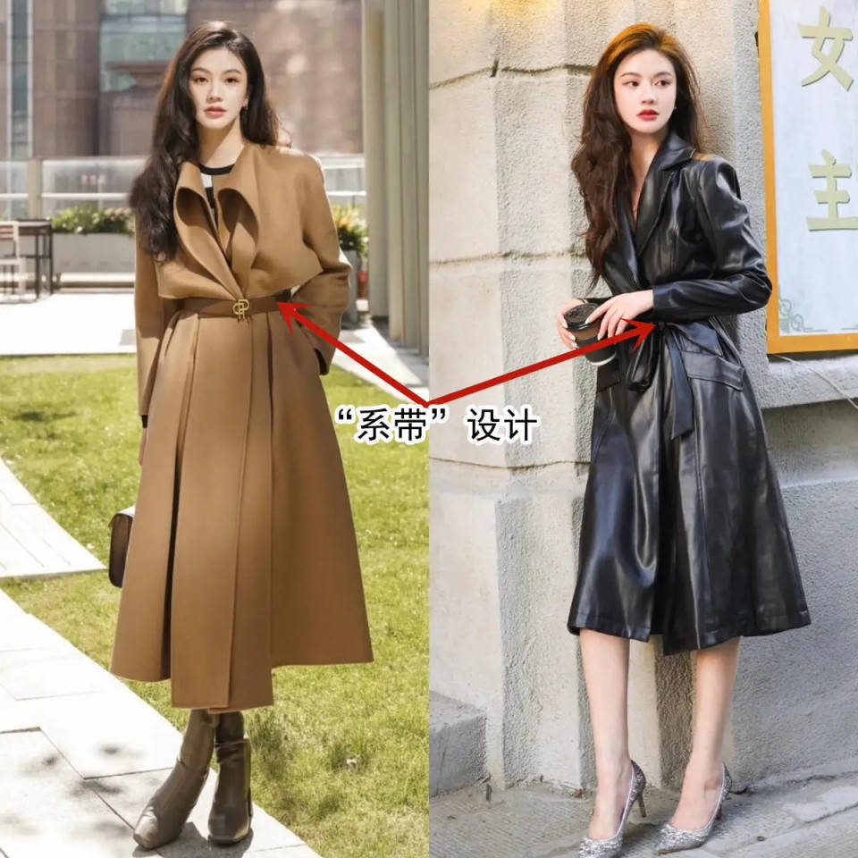 把自带腰带的大衣外套打个蝴蝶结系起来,就能很好的勒出小蛮腰,形成高腰线,呈现出凹凸有致的身材比例。